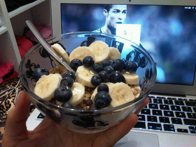 150g grekisk jogurt, ½ banan, amerikanska blåbär, ½ näve granola, lite acacia honung