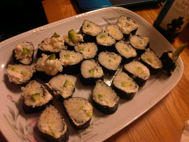 Kom precis hem från Linda. Spenderat några timmar hos henne med 2 glas vitt (jag körde jue, så fick nöja mig med det) och så gjorde Linda sushi. Supergott, med avocado, gurka och krabbröra. Sedan blev det lite lösgodis och chokladtryfflar. Jaja, ibland får man unna sig..hihi... Mysigt med lite girl talk iaf :)